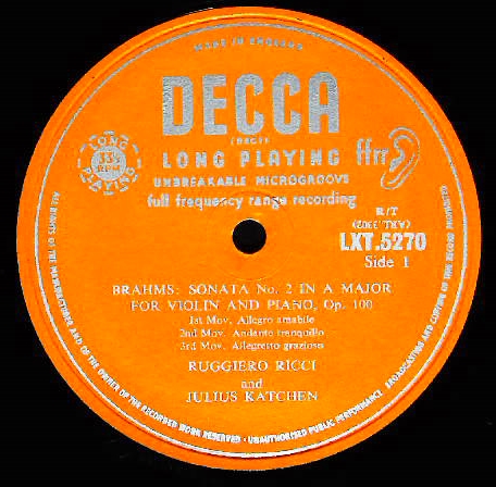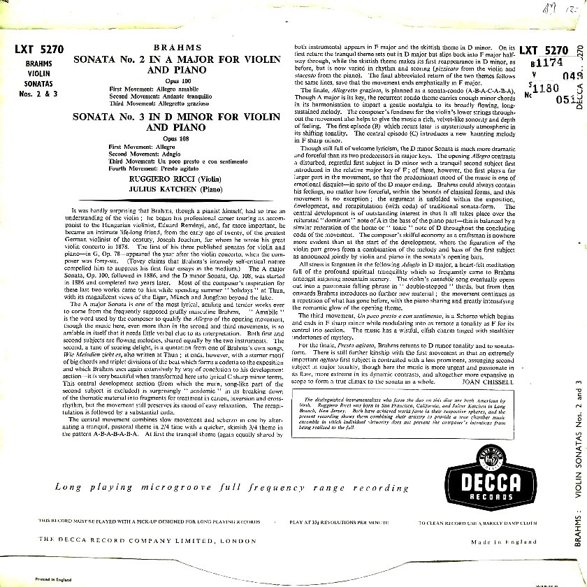 商品コード:1180-051[DECCA] R.リッチ(vn) J.カッチェン(pf) / ブラームス:Vnソナタ2番Op.100, 3番Op.108