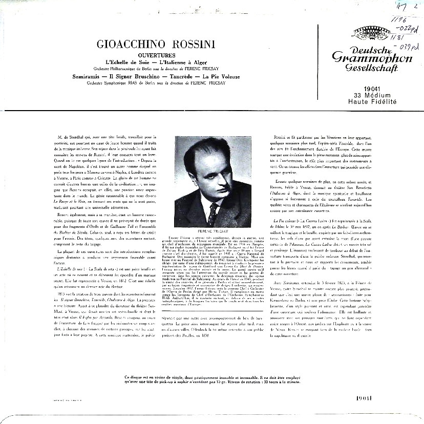 商品コード:1181-039pd[DGG] F.フリッチャイ指揮ベルリンpo. ベルリン放送(旧名RIAS)so. / ロッシーニ:序曲集