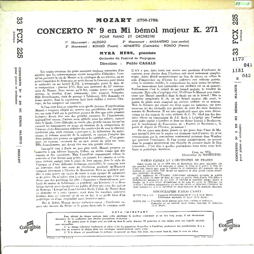 商品コード:1181-042p[COLUMBIA] M.ヘス(pf) P.カザルス指揮ペルピニャン祝祭o. / モーツァルト:Pf協奏曲9番K.271