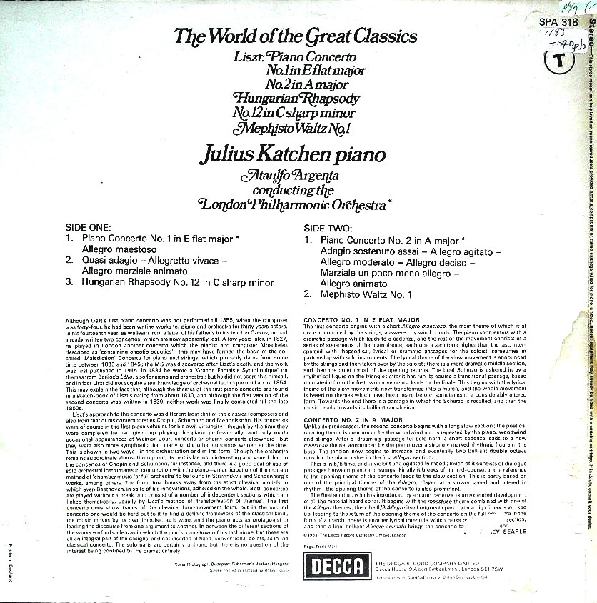 商品コード:1183-040pb[DECCA] J.カッチェン(pf) A.アルヘンタ指揮ロンドンpo. / リスト:Pf協奏曲1, 2番