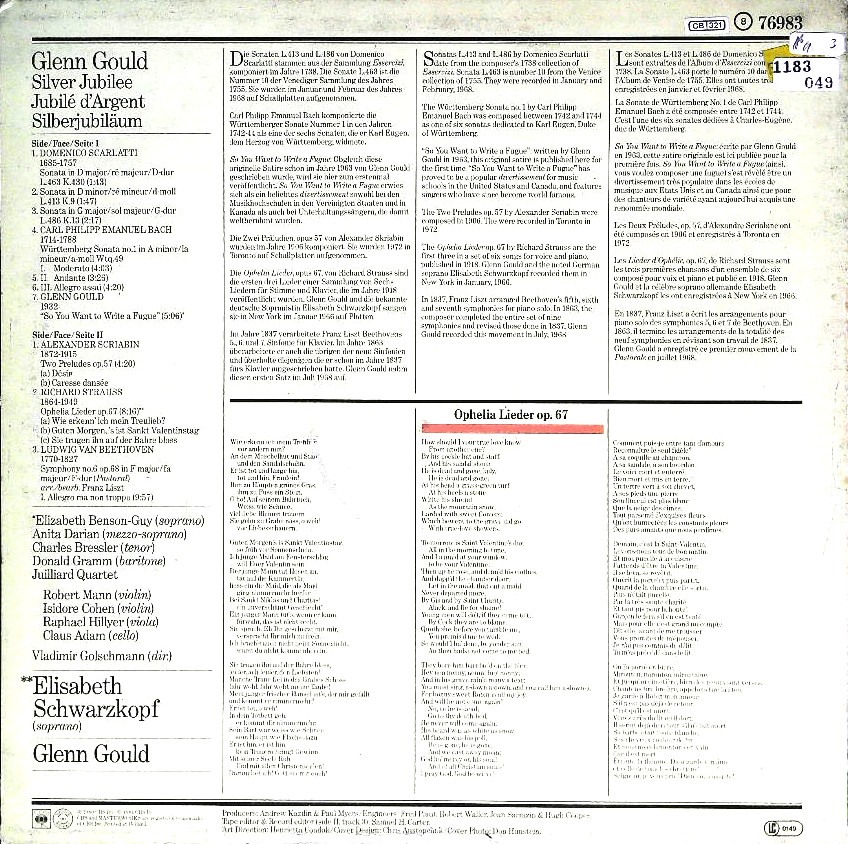 商品コード:1183-049[CBS] G.グールド(pf) E.シュヴァルツコップ(s) ジュリアードQt. E.ベンソン・ガイ(s) A.ダーリアン(ms) C.ブレッスラー(t) 他/ 「シルバー・ジュビリー・アルバム」