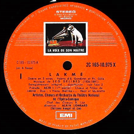 商品コード:BOX-795[仏La Voix De Son Maître] A.ロンバール指揮パリ・オペラ・コミークo.cho., M.メスプレ(s), C.ビュルル(t), R.ソワイエ(bs)他 / ドリーブ:「ラクメ」(全曲)
