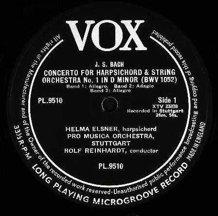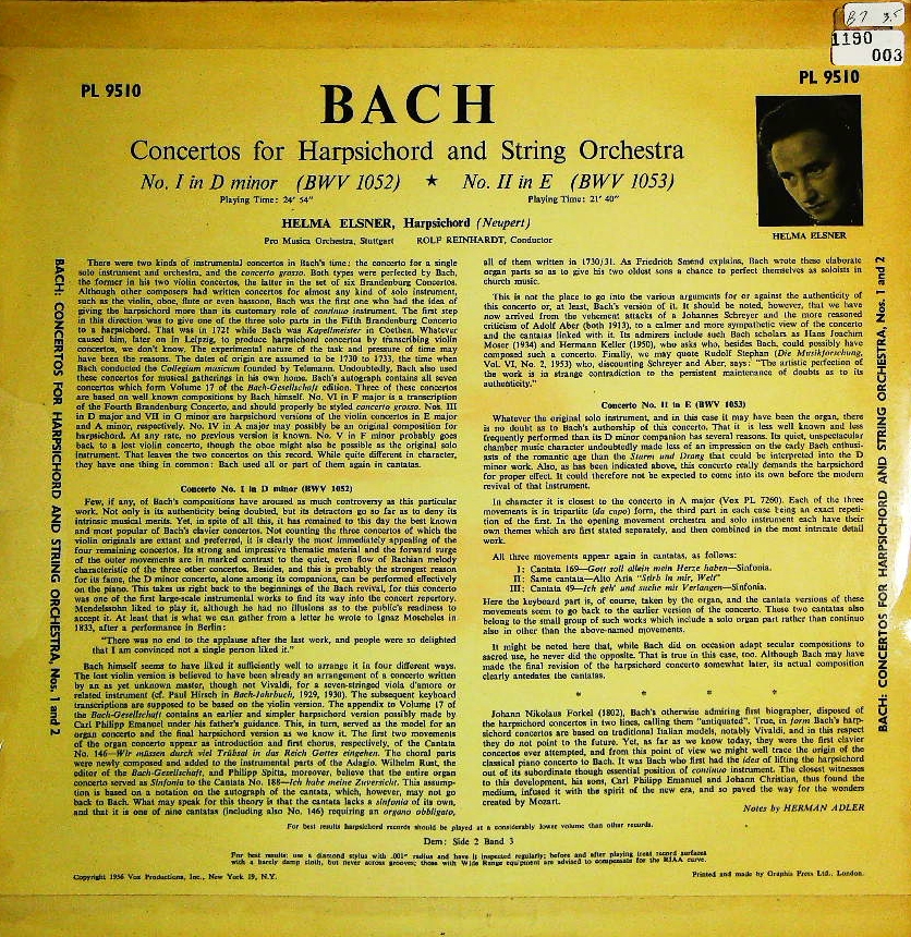 商品コード:1190-003[Pathé-VOX] H.エルスナー(cemb) R.ラインハルト指揮/ バッハ:Cemb協奏曲1番B.1052, 2番B.1053