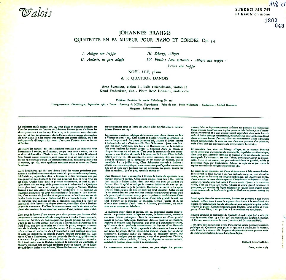 商品コード:1200-043[VALOIS] N.リー(pf) デンマークQt.(ダノワQt.) / ブラームス:Pf五重奏曲Op.34