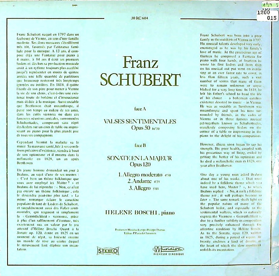 商品コード:1200-015p[MUSIDISC] H.ボッシ(pf) / シューベルト34の感傷的なワルツ Op.50 D.779, Pfソナタ13番Op.120