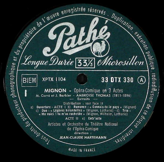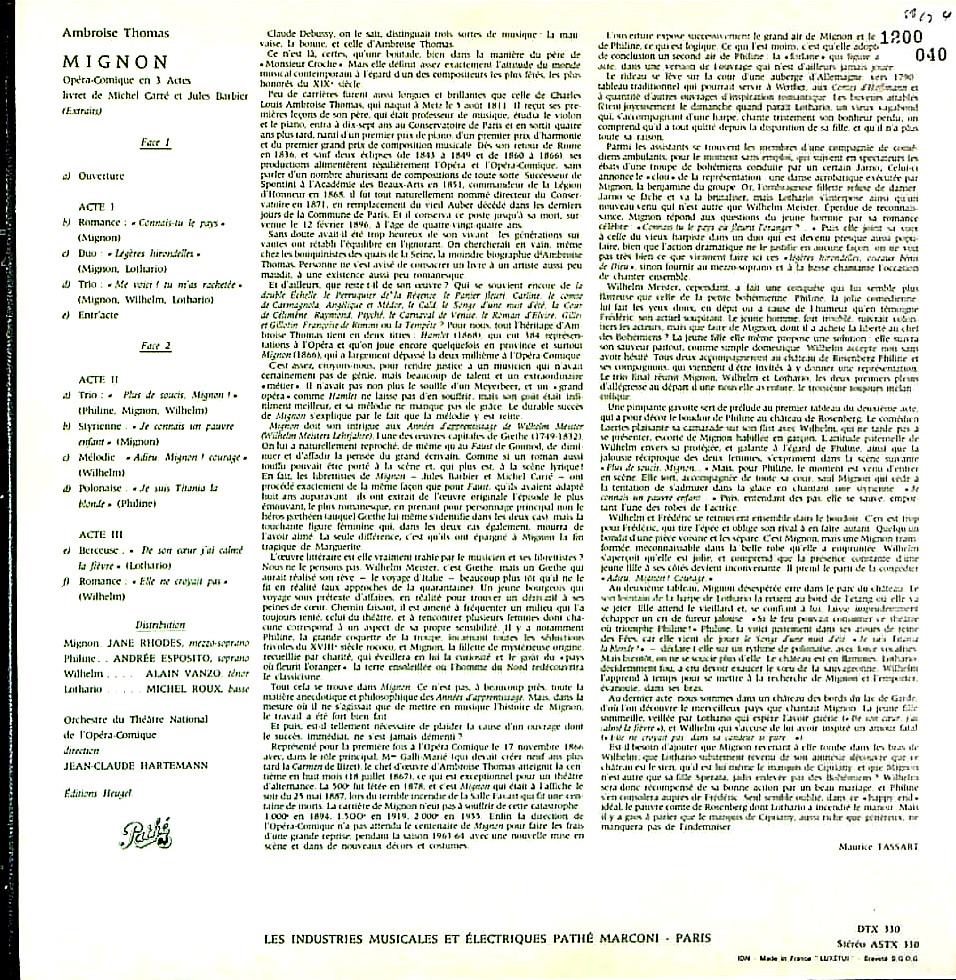 商品コード:1200-040[Pathé ] J.C.アルトマン指揮パリ・オペラ・コミークo., J.ロード(ms) A.エスポージト(s) A.ヴァンゾ(t) Mルー(bs) / トマ:歌劇「ミニョン」(抜粋)