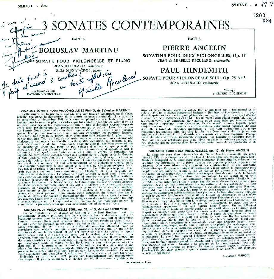 商品コード:1200-024[ORPHÉE] J&M.レクラール(vc) E.メナト・グロブ(pf) / マルティヌー:Vcソナタ, ヒンデミット:無伴奏VcソナタOp.25-3, アンスラン:2VcのためのソナチネOp.17