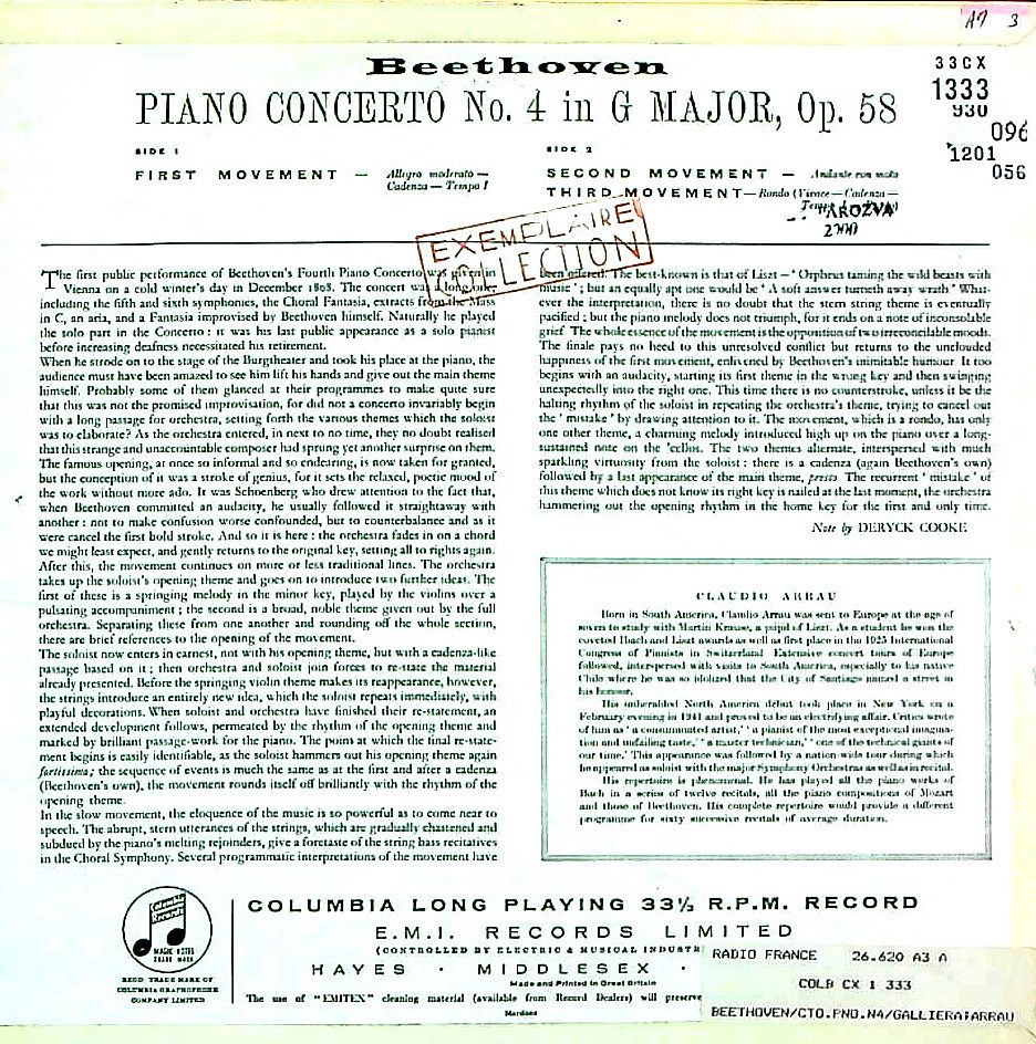 商品コード:1201-056t[COLUMBIA] C.アラウ(pf) A.ガリエラ指揮フィルハーモニアo. / ベートーヴェン:Pf協奏曲4番Op.58