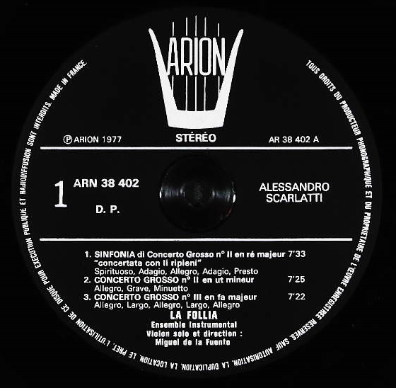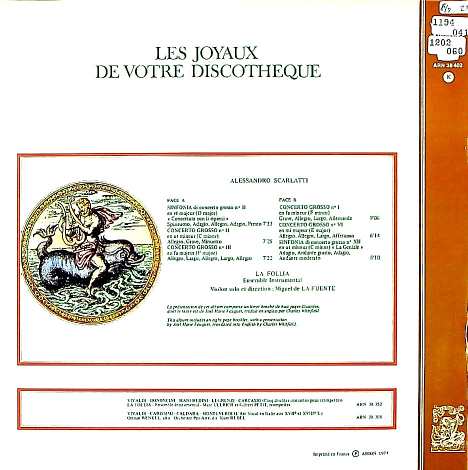 商品コード:1202-060[ARION] M.デ・ラ・フエンテ(vn)指揮ラ・フォリア器楽Ens. / A.スカルラッティ:シンフォニア「Concertata Con Lì Ripieni」, 合奏協奏曲1, 2, 3, 6, 12番