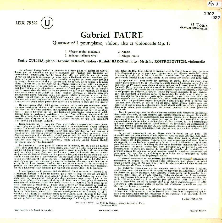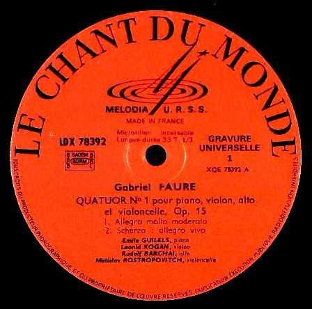 商品コード:1202-027[Le Chant de Monde] E.ギレリス(pf) L.コーガン(vn) R.バルシャイ(va) M.ロストロポーヴィチ(vc) / フォーレ:Pf四重奏曲1番Op.15