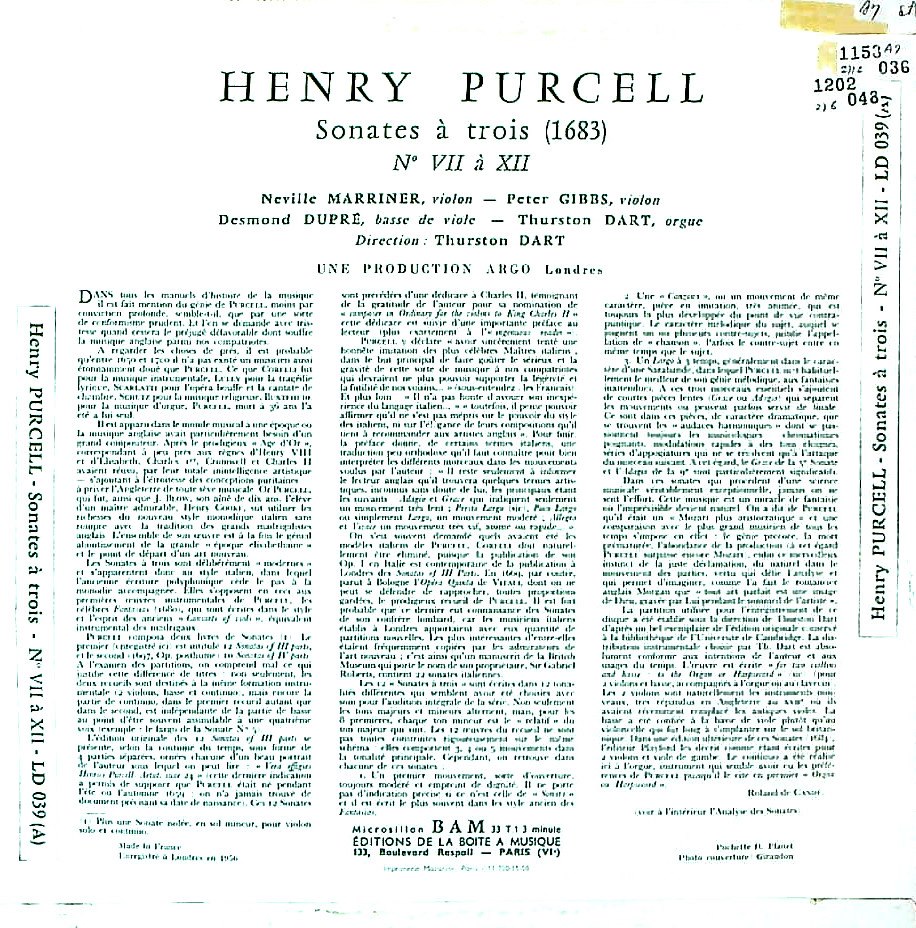 商品詳細:フィルハーモニア管やロンドン響のヴァイオリニストを務めたマリナーが、サーストン・ダートと共に結成した「ジャコビアン・アンサンブル」によるパーセルの曲集。コンティヌオはダートのオルガンによる。楽器はストラディヴァリをはじめ、全てオリジナル楽器が使われていて、いい意味で学究的な演奏だが、パーセルの器楽曲として最上のものと言えるだろう。印象的な旋律で聴かせる曲ではなく、三声の扱いの妙が持ち味なので、このようなスタイルはいつになっても不滅だ。英ARGO/RG 84-5(バラ2枚)が音源。パーセルの室内楽にはトリオ・ソナタ形式で12曲の3声のソナタ集と10曲の4声のソナタ集がある。録音は3声のソナタ集全12曲で初の全曲録音と思われる。今見ると英国屈指の凄いメンバーが集う。マリナーが一介のヴァイオリニストとして登場。若き日のネヴィル・マリナーが第1ヴァイオリンを担当しサーストン・ダートがリーダーを務めた在りし日の二人の偉大な音楽家の姿が活き活きと捉えられいる。ダートは道半ばで亡くなってしまったがマリナーはその後長生きし英国を代表する大物指揮者へと上りつめた。マリナーが本当にやりたかった音楽がここにある。かなり希少。ARGO音源だがフランスBAMも負けず劣らず良い音質!