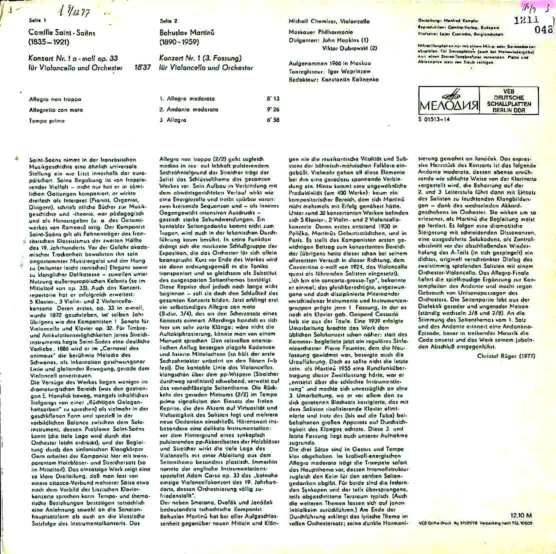 商品コード:1211-048t[ETERNA] M.ホミツェル(vc) J.ホプキンス V.ドブロフスキー指揮モスクワpo. / サン・サーンス:Vc協奏曲1番Op.33, マルティヌー:Vc協奏曲1番
