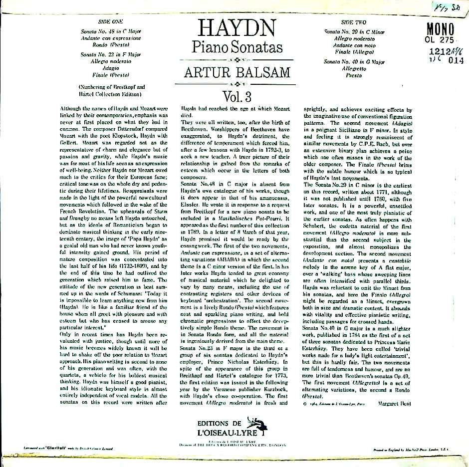 商品コード:1212-014p[L'OISEAU LYRE] A.バルサム(pf) / ハイドン:Pfソナタ集1~3