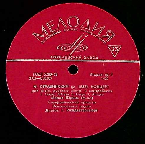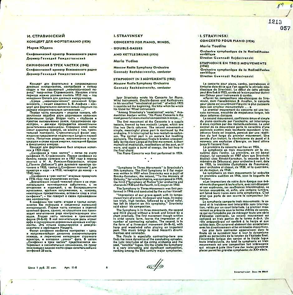 商品コード:1213-057n[MELODIYA] M.ユーディナ(pf) G.ロジェストヴェンスキー指揮ソビエト放送o. / ストラヴィンスキー:Pfと管楽器の協奏曲, 3楽章の交響曲