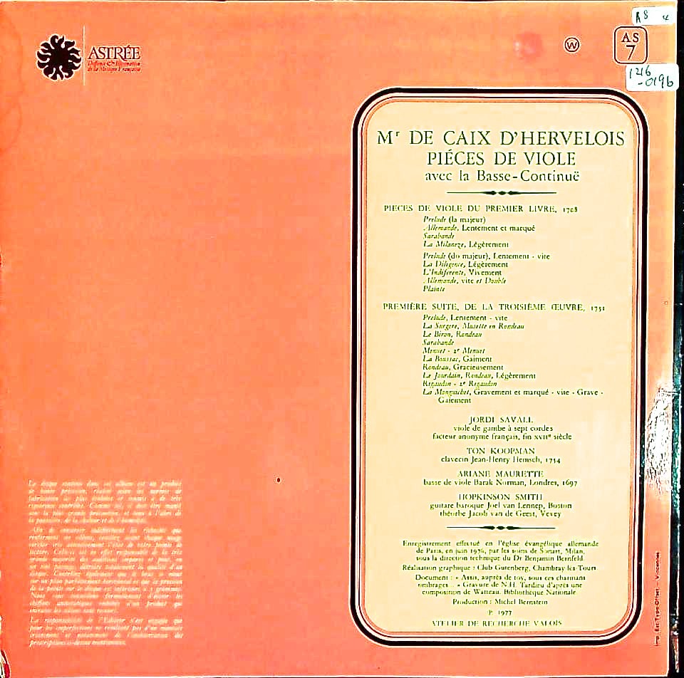 商品コード:1216-019b[ASTRÉE] J.サヴァール(gamb) T.コープマン(cemb) A.モーレット(バス・ヴィオール) H.スミス(バロックgt/テオルボ) / デルブロワ:ヴィオール曲集/第1巻(1708), 第3巻(1731)