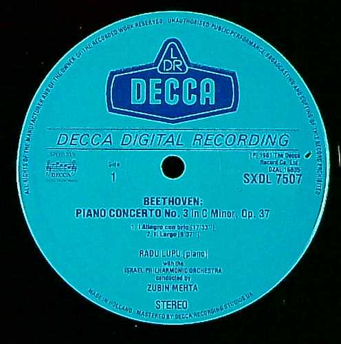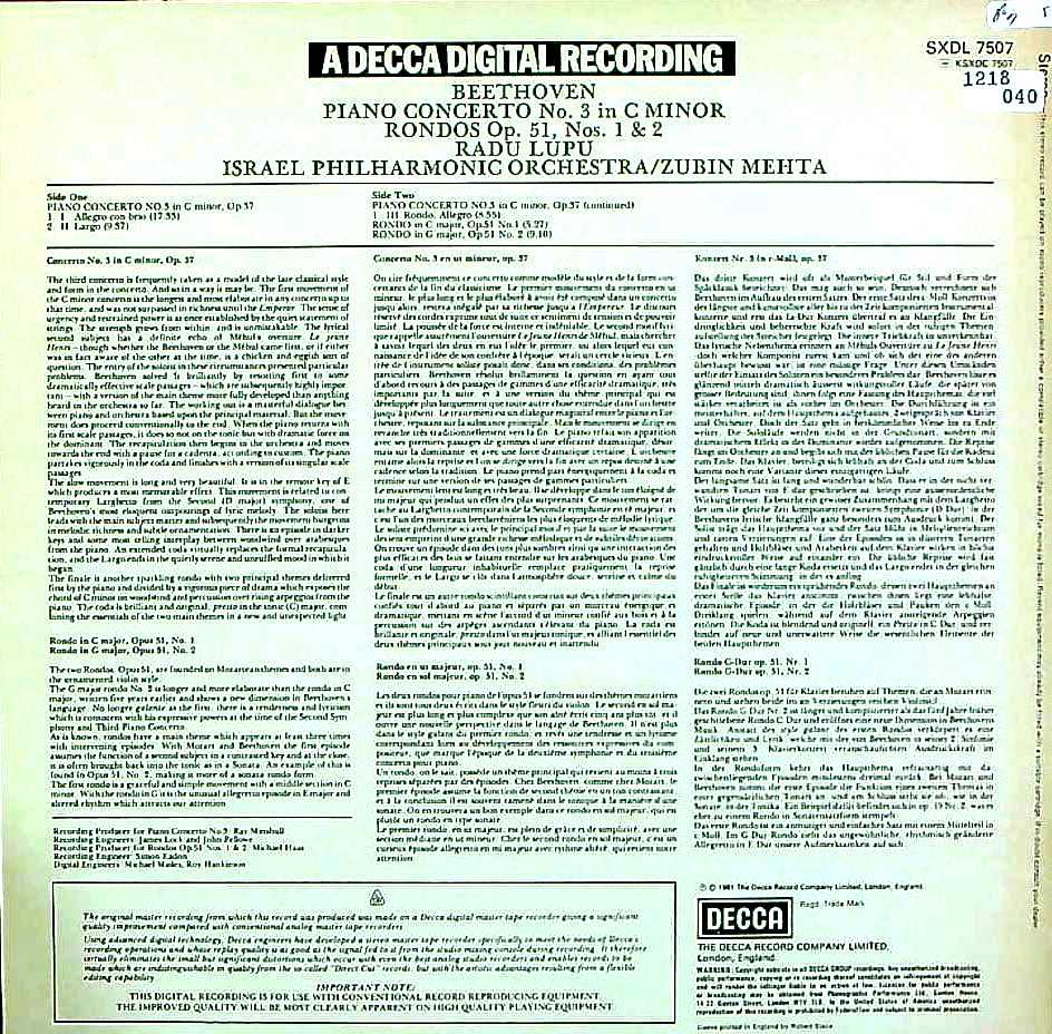 商品コード:1218-040[DECCA] R.ルプ(pf) Z.メータ指揮イスラエルpo. / ベートーヴェン:Pf協奏曲3番Op.37,2つのロンドOp.51-1/2