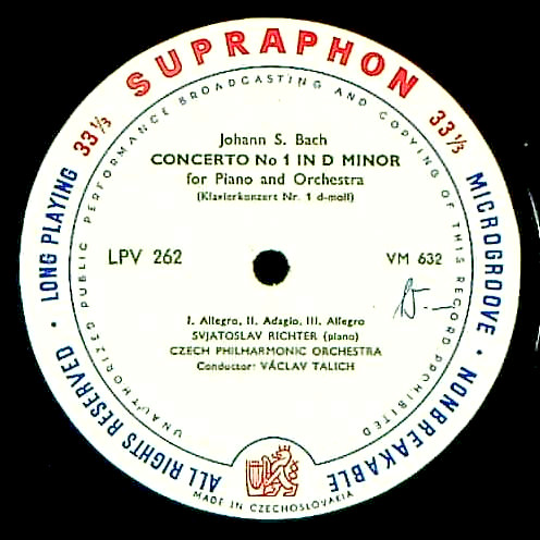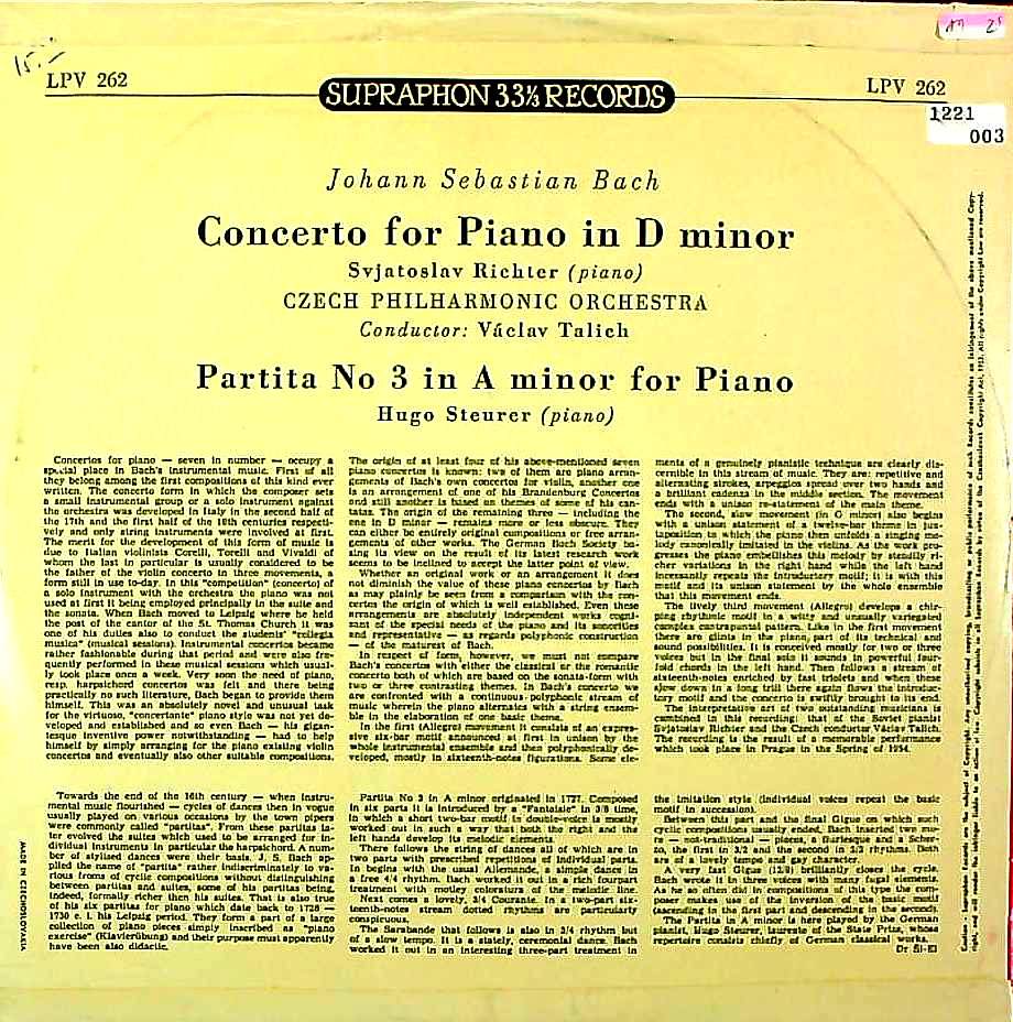商品コード:1221-003t[SUPRAPHON] S.リヒテル(pf) V.ターリヒ指揮チェコpo./H.シュトイラー(pf)/ バッハ:Pf協奏曲1番B.1052, パルティータ3番B.827