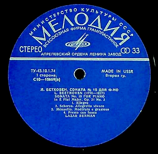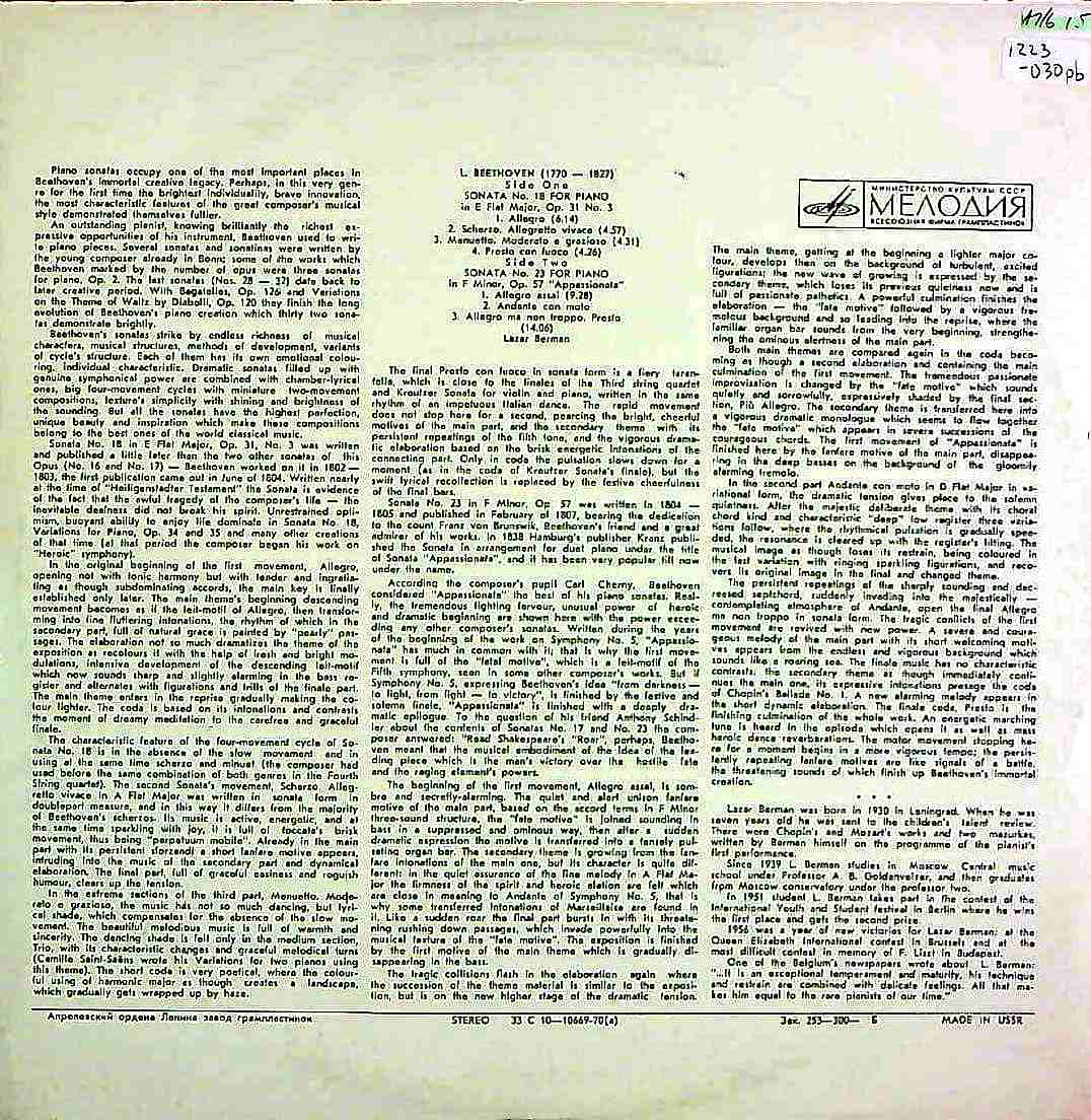 商品コード:1223-030pb[MELODIYA] L.ベルマン(pf) / ベートーヴェン:Pfソナタ18番Op.31-3, Pfソナタ23番「熱情」
