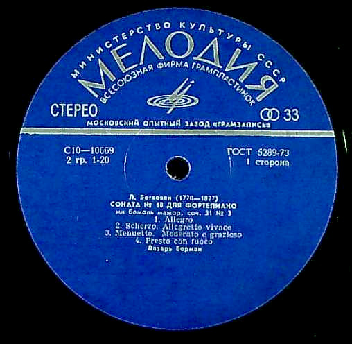 商品コード:1223-030p[MELODIYA] L.ベルマン(pf) / ベートーヴェン:Pfソナタ18番Op.31-3, Pfソナタ23番「熱情」