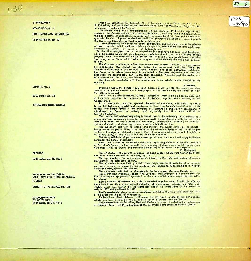 商品コード:1223-007pb[MELODIYA] R.ケレル(pf) K.コンドラシン指揮モスクワpo. / プロコフィエフ:Pf協奏曲1番Op.10, Pfソナタ3番, 前奏曲Op.12-7, 3つのオレンジの恋~行進曲, リスト, ラフマニノフ
