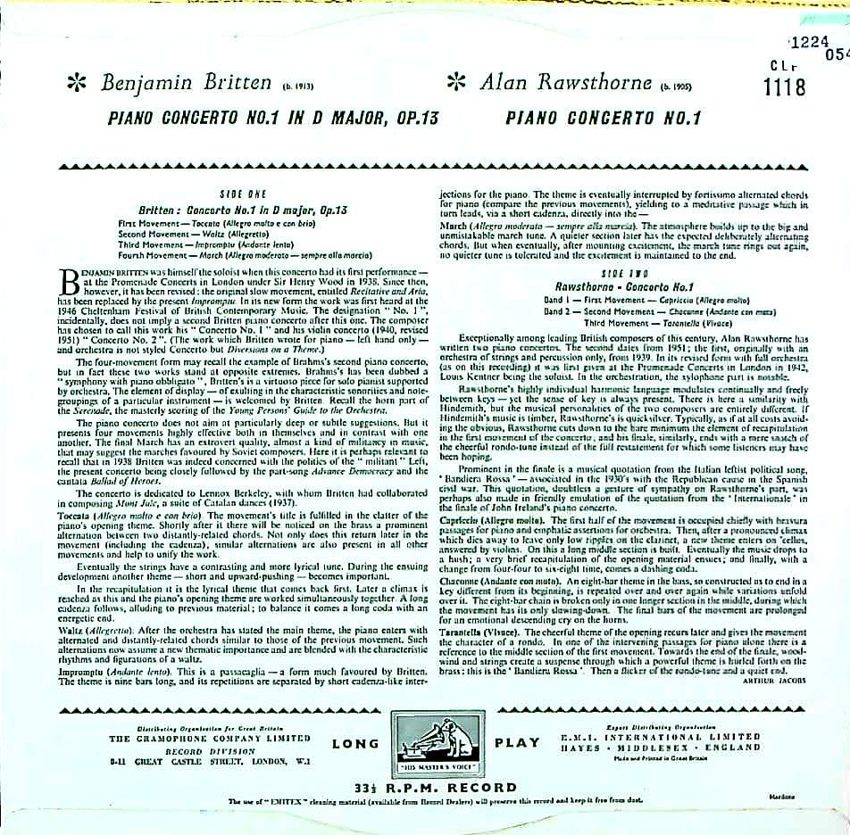 商品コード:1224-054p[His Master's Voice ] M.リンパニー(pf) H.メンゲス指揮フィルハーモニアo. / ブリテン:Pf協奏曲1番Op.13, A.ロースソーン:Pf協奏曲1番