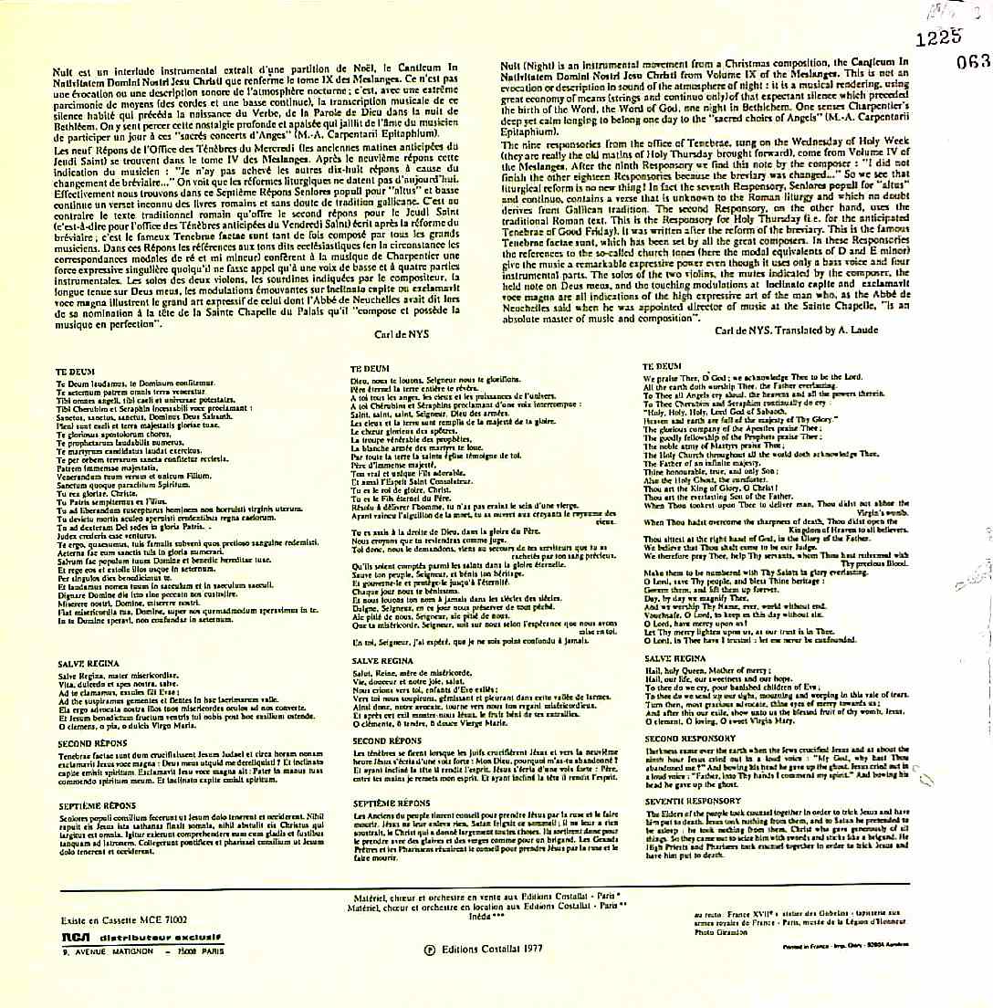 商品コード:1225-063[ERATO] M.コルボ指揮グルベンキアンso.cho. J.シルヴァ(s) P.フッテンロッハー(bs) 他 / シャルパンティエ:テ・デウム, サルヴェ・レジナ, 地上は暗闇となった, 夜, 町の長老たちは