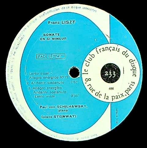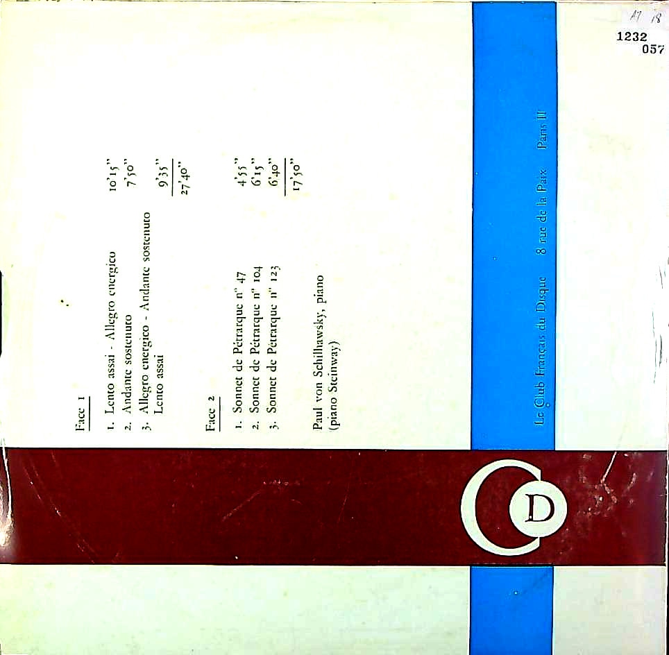 商品コード:1232-057[Le Club Français Du Disque] P.v.シルハフスキー(pf) / リスト:Pfソナタロ短調, ペトラルカのソネット47, 104, 123番