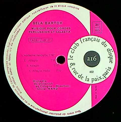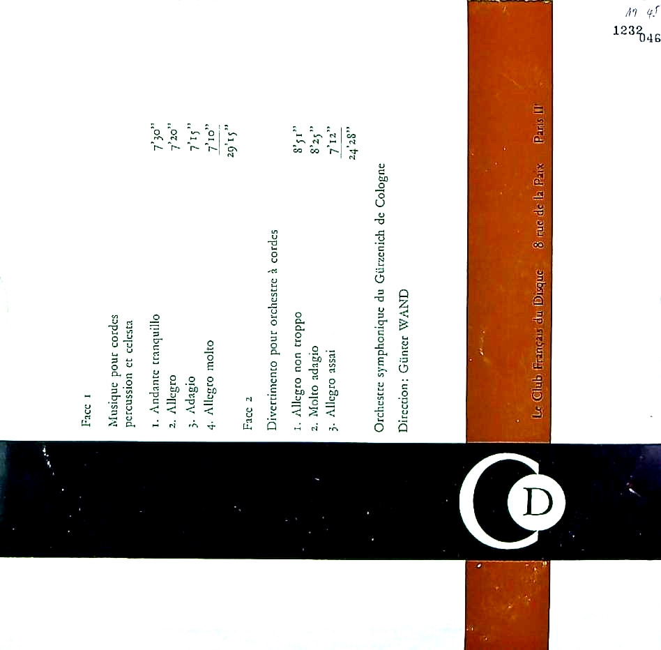 商品コード:1232-046[Le Club Français Du Disque] G.ヴァント指揮ケルン・ギュルツェニヒso. / バルトーク:弦楽器・打楽器とチェレスタのための音楽, 弦楽のためのディヴェルティメント