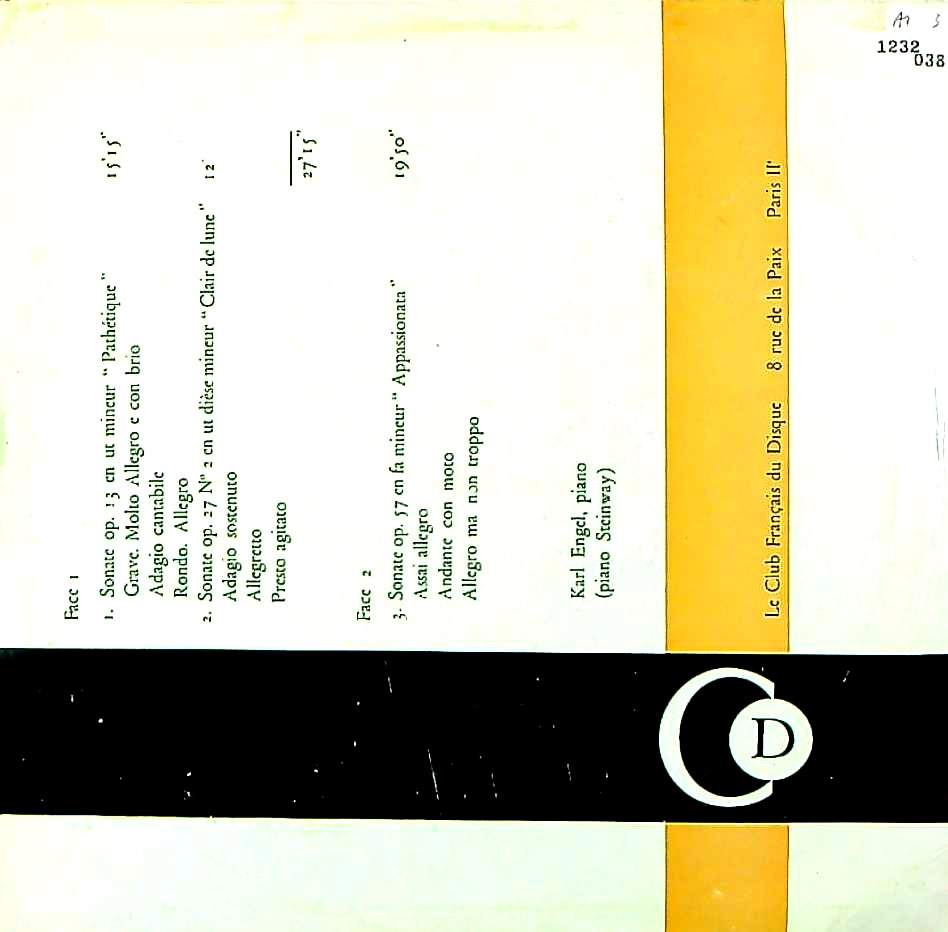 商品コード:1232-038[Le Club Français Du Disque] K.エンゲル(pf) / ベートーヴェン:Pfソナタ8番「悲愴」, 14番「月光」, 23番「熱情」
