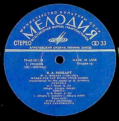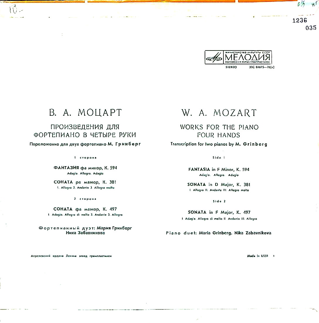 商品コード:1236-035p[MELODIYA] M.グリンベルグ, N.ザバフニコワ(pf) / モーツァルト:4手Pf作品集/幻想曲K.594, ソナタK.381, 497