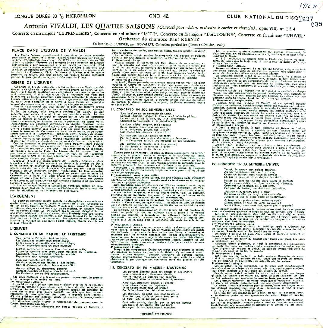 商品コード:1237-039[Club National du Disque] P.キュンツ指揮ポール・キュンツ室内o. M.フラスカ・コロンビエ(vn) / ヴィヴァルディ:四季