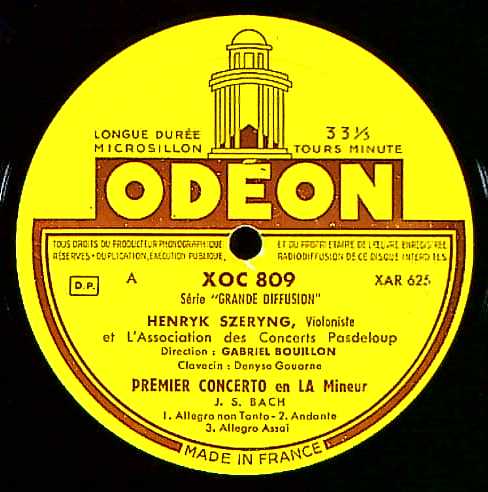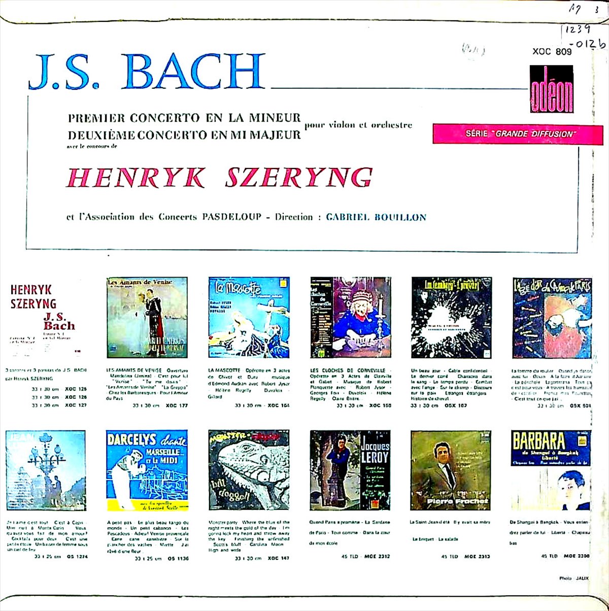 商品詳細:1950年~1955年までの間にヘンリク・シェリング(1918- 1988)は生涯における重要な録音を数点残している。シェリングはワルシャワ生まれのユダヤ系ポーランド人で、メキシコに帰化したヴァイオリニスト・作曲家。ODÉON以前のメキシコにSP録音などが数点あるがLP期ではODÉONレーベルが最初のレーベルになる。1955年に入れたバッハ:無伴奏ヴァイオリンのためのソナタとパルティータの初回録音が最も名高いが、その3年前の1952年にバッハ:Vn協奏曲1/2番の2曲をパリで録音していた。このオリジナルはODX 114でリリースされODX 122-124で出た無伴奏と同様に希少であり、綺麗な盤が少ないLPである。この2曲がシェリングの記念すべき最初のバッハ録音となった。指揮者のガブリエル・ブイヨンは当時パリ音楽院で指導していた教師で、ヴラド・ペルルミュテールやピエール・フルニエとトリオを組んでいた経歴の持ち主。オケのコンセール・パドルーは1861年に始まるフランス最古の、パリのコンサート・オーケストラである。ジュール・パドルーがコンセール・ポピュレールとして創設した。コンセール・ポピュレールは後発のコンセール・コロンヌ(1873年設立)やコンセール・ラムルー(1881年設立)に押され、1884年に活動を停止した。第一次世界大戦が終わった1918年、映画企業家セルジュ・サンベール(Serge Sandberg)が、このオーケストラを復活し、ルネ=バトン(Rhené-Baton)へ指揮を委ねた。演奏会場は、まず昔のサーカス小屋、それからガルニエ宮、マガドール劇場(Théâtre Mogador)、シャイヨ宮、シャンゼリゼ劇場、サル・プレイエル(Salle Pleyel)と移り、1921年からコンセール・パドルーを名乗った。パリで最初にできた大衆向けのオケである。さて演奏はいささか真面目すぎるほどに真摯で丁寧な演奏で当時のフランス人にはいささか硬すぎると思えるほど堅実な演奏である。星の数ほどあるこの2曲の録音の中でトップであるとは言い難い、また音色に関しても後のPHILIPSに移ってからの方が艶やかな音を出していて、シェリングの長い演奏史の中でもベストとは言えない録音である。しかしそれらを差し引いても、控えめに留めた表現にはバッハへの強い畏敬が込められいるのは間違いない。細部に宿る曲への奉仕の心情は音に反映されており、これらと相まって名演の一つであるとしても疑問はない演奏であると言える。フランスでのプレスの順序は1954年頃ODEON:ODX 114(当装丁)にて初リリース→1956年頃XOC 112(黄/茶内溝フラット盤・新デザインジャケット入り)→1962年頃XOC 809(黄/茶段付レーベル・グルーヴガード厚手)・当盤→1969年頃仏CBS:51009--と変遷する。RIAAカーヴはXOC 809(当盤)からと思われる。