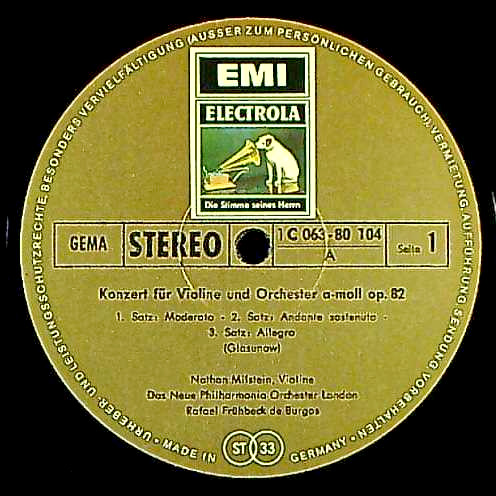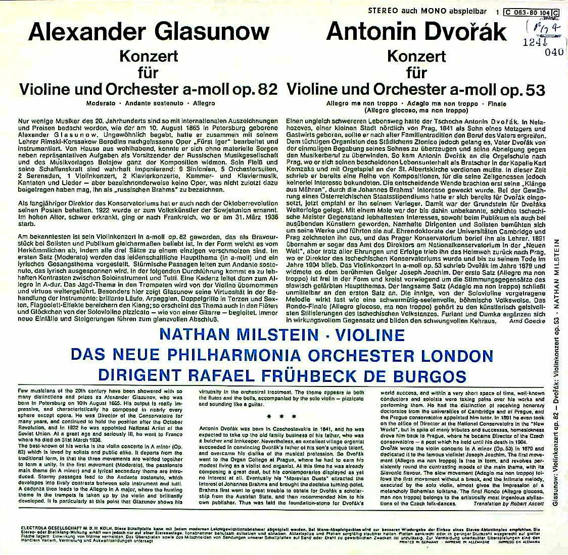 商品コード:1241-040[ELECTROLA] N.ミルシテイン(vn) R.フリューベック・デ・ブルゴス指揮 / グラズノフ:Vn協奏曲, ドヴォルザーク:Vn協奏曲