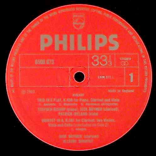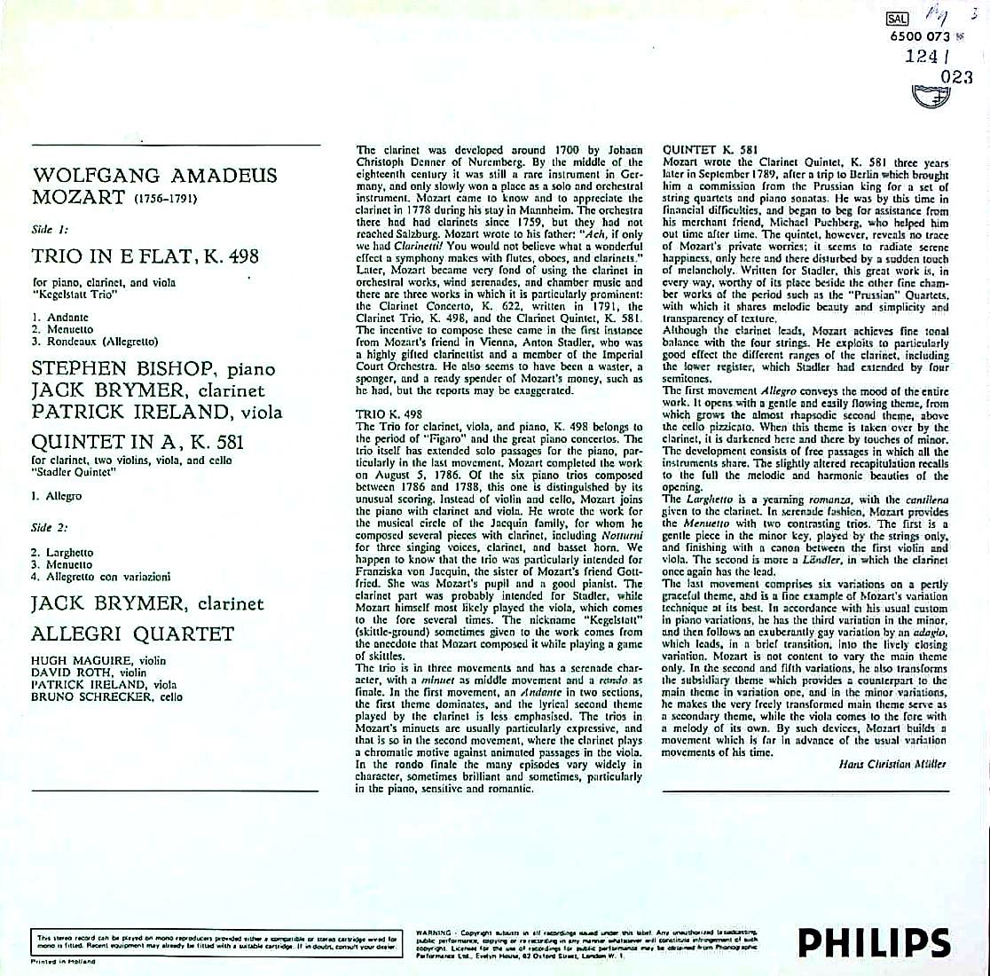 商品コード:1241-023[PHILIPS] S.ビショップ(pf) J.ブライマー(cl) P.アイルランド(va) アレグリQt./ モーツァルト:Cl五重奏曲K.581, ClトリオK.498