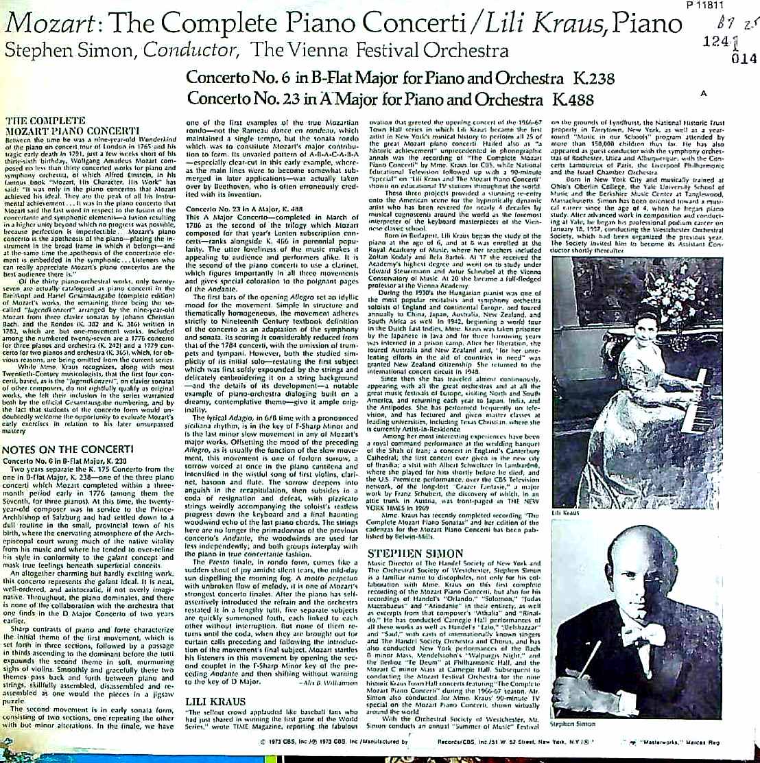 商品コード:1241-014[COLUMBIA] L.クラウス(pf) S.サイモン指揮ウィーン祝祭o. / モーツァルト:Pf協奏曲集6番K.238, Pf協奏曲集23番K.488