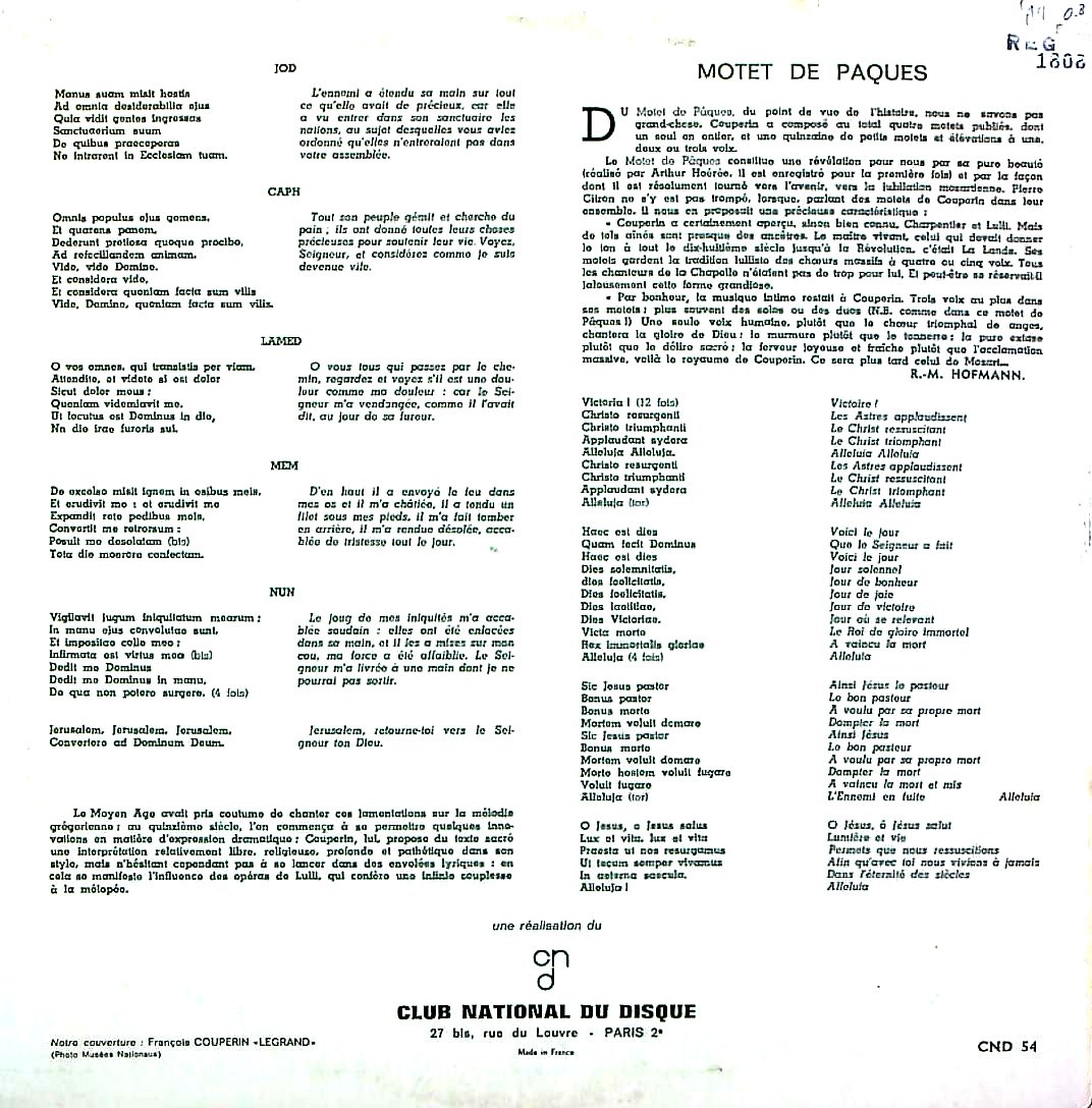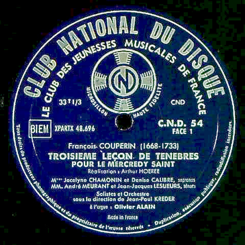 商品コード:REG-1808[仏Club National du Disque] J.P.クレーデ指揮ジャン=ポール・クレーデo.M.J.シャモニン, D.キャリブル(s) 他/ クープラン:聖水曜日のための3つのルソン・ド・テネブル