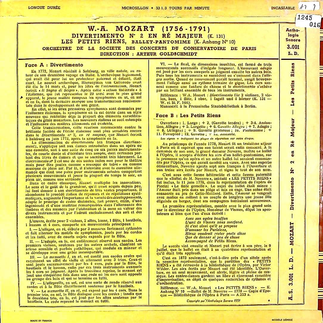 商品コード:1245-016[L'Anthologie Sonore] A.ゴールドシュミット指揮パリ音楽院o. / モーツァルト:ディヴェルティメント2番K.131, バレエ音楽「レ・プティ・リアン」K.299b(Anh.10)