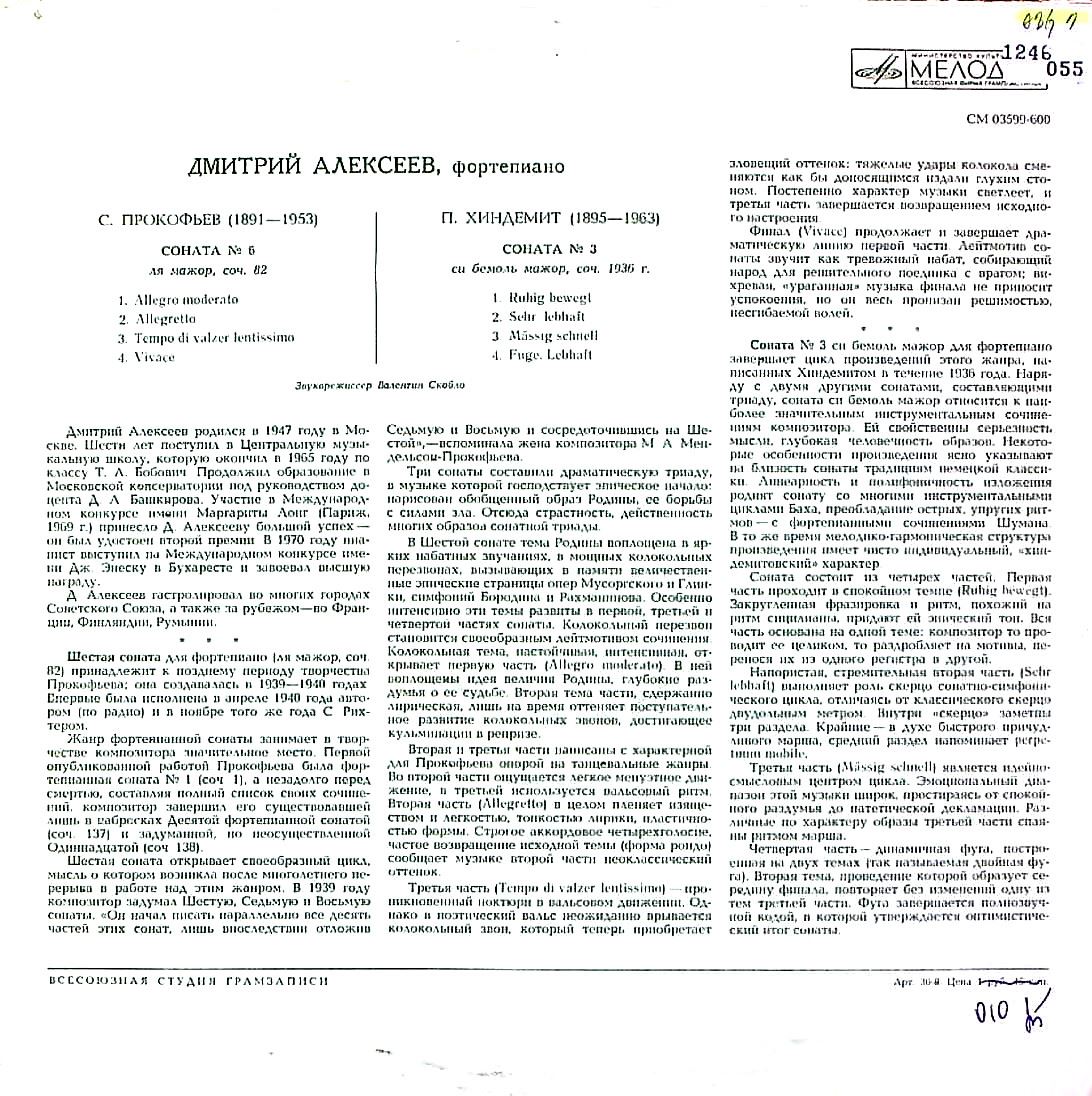商品コード:1246-055n[MELODIYA] D.アレクセーエフ(pf) / プロコフィエフ:Pfソナタ6番Op.82, ヒンデミッt:Pfソナタ3番(1936)