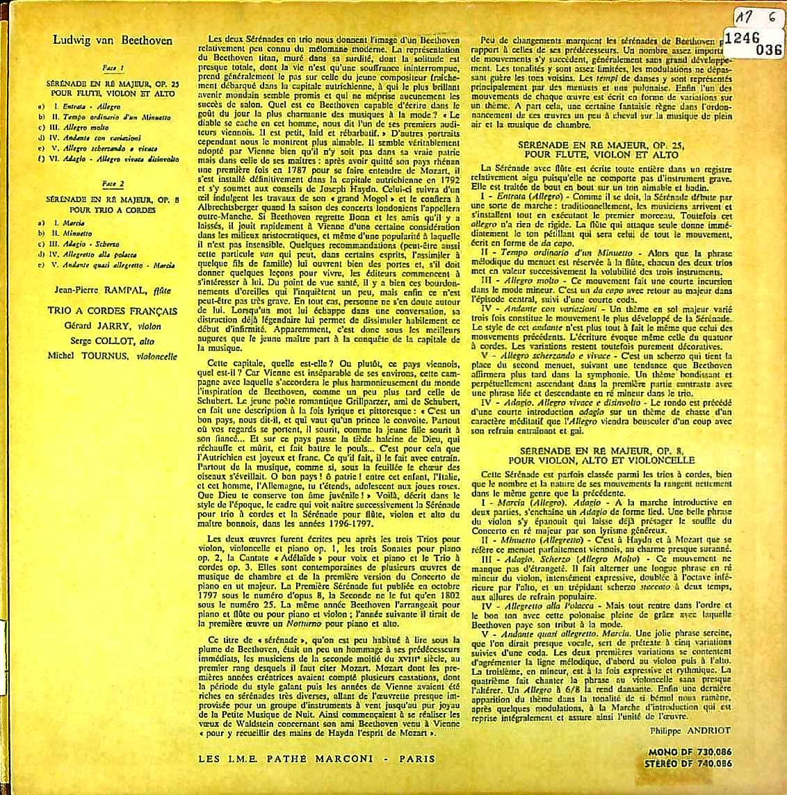 商品コード:1246-036[Les Discophiles Français] J.P.ランパル(fl) フランス弦楽トリオ/ ベートーヴェン:Fl・Vn・Vaのためのセレナーデ, 弦楽三重奏のためのセレナーデ