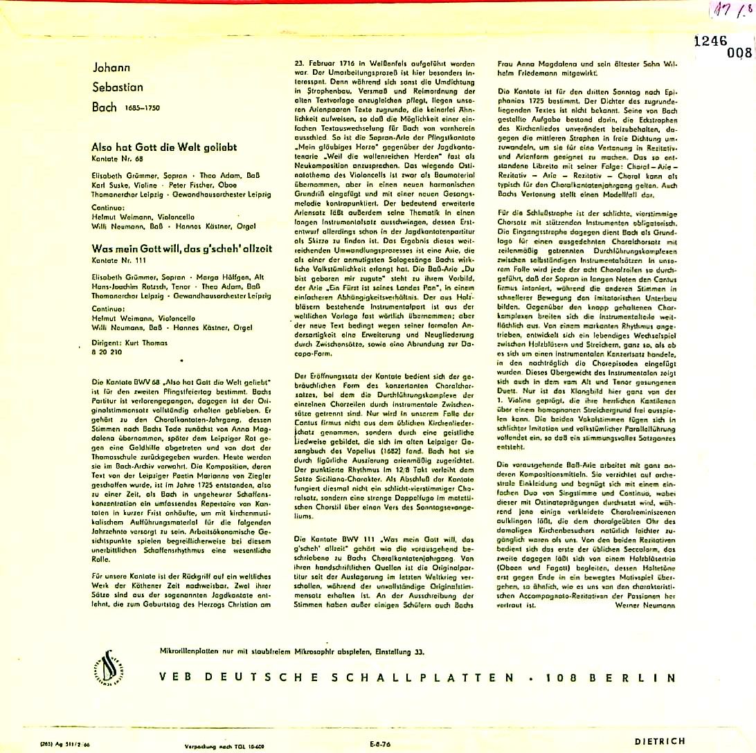 商品コード:1246-008t[ETERNA] K.トーマス指揮トーマス教会cho. E.グリュンマー(s) M.ヘフゲン(a) H.J.ロッチュ(t) T.アダム(bs) K.ズスケ(vn) 他/ バッハ:カンタータ68番, 111番