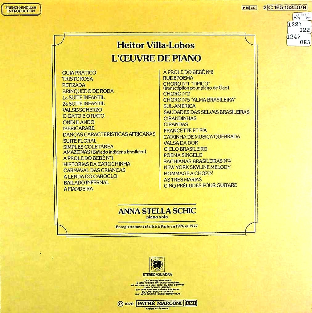 商品詳細:おそらくヴィラ・ロボスのPf作品を全曲録音したというのはアナ・ステラ・シックだけなのではないだろうか。ヴィラ・ロボスとは親交があり、作品の初演を世界各地で行った。ヴィラ・ロボスのPf作品というと、同時期に活躍した、同じくブラジル出身のタリアフェロの名演を思い出すが、シック女史の演奏は、それに負けず劣らずの名演と言えるだろう。全曲録音の決定盤!アナ・ステラ・シック(Anna Stella Schic)(1925 – 2009)はブラジル生まれの女性ピアニスト。ヴィラロボスの伝記の著書(Villa-Lobos:Souvenirs del'Indienblanc)を1987年に上梓している。ブラジルでホセ・クリアスに師事。ホセ・クリアスはリストの弟子である。その後、彼女はパリでマルグリット・ロンに師事。フランスの作曲家Michel Philippotと結婚し、1971年からフランスに移住している。ピアニストとしてのキャリアに加えて、彼女はリオデジャネイロ連邦大学とリオデジャネイロ大学で教鞭を執った。この録音は1976-1977年パリで行われ、これが世界初の完全なピアノ作品全集となった。興味のある方には十分役立つ箱と思われる。