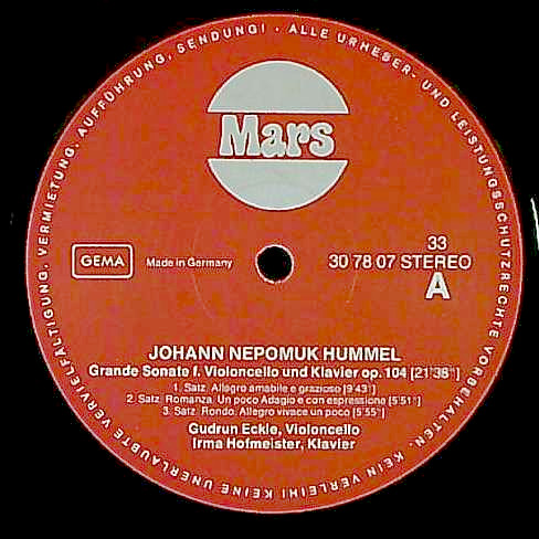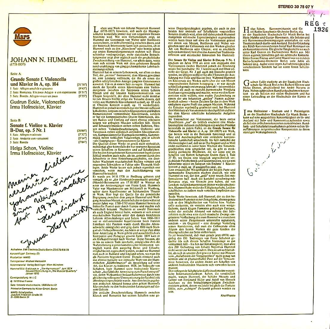 商品コード:REG-1936t[独MARS] H.ショーン(vn) G.エックル(vc) I.ホフマイスター(pf) / フンメル:Vcソナタ「グランド・ソナタ」, Vnソナタ