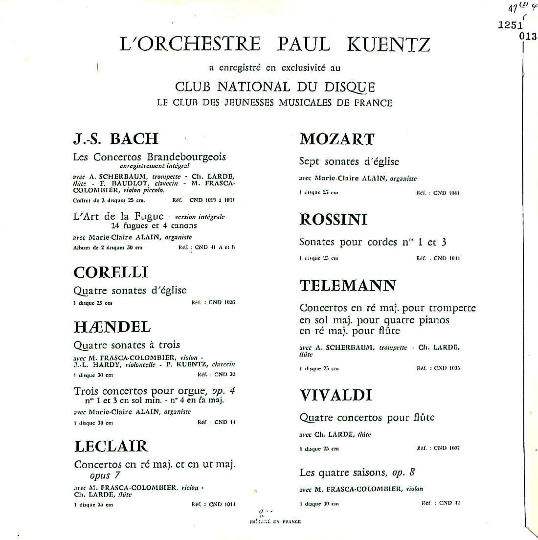 商品コード:1251-013[Club National du Disque] M.フラスカ・コロンビエ, L.ガルニエ(vn) P.キュンツ指揮/バッハ:Vn協奏曲B.1041,1042, 2Vn協奏曲B.1043,1060