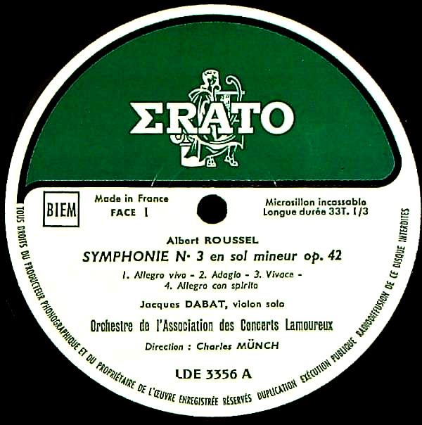 商品コード:REG-1970[仏ERATO] C.ミュンシュ指揮コンセール・ラムルー協会o. J.ダバ(vn) / ルーセル:交響曲3番Op.42, 交響曲4番Op.53