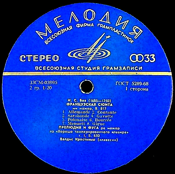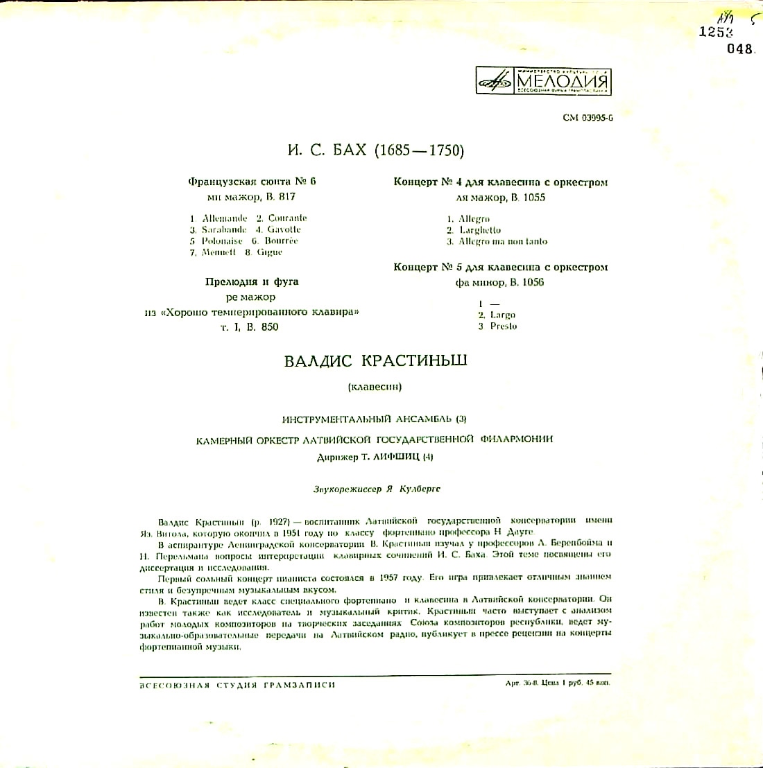 商品コード:1253-048n[MELODIYA] V.クラステインシュ(cemb) T.リフシッツ指揮ラトビアpo. / バッハ:フランス組曲6番B.817, 平均律クラヴィーア曲集 第1巻~第5曲B.850, Cemb協奏曲1055, 1056