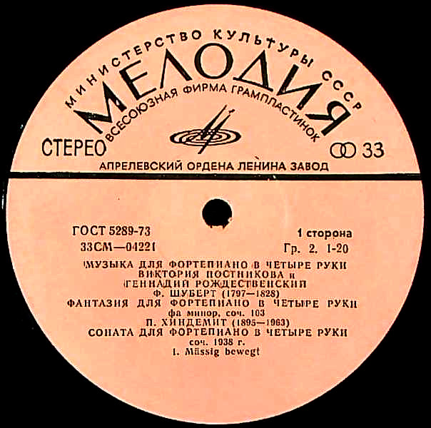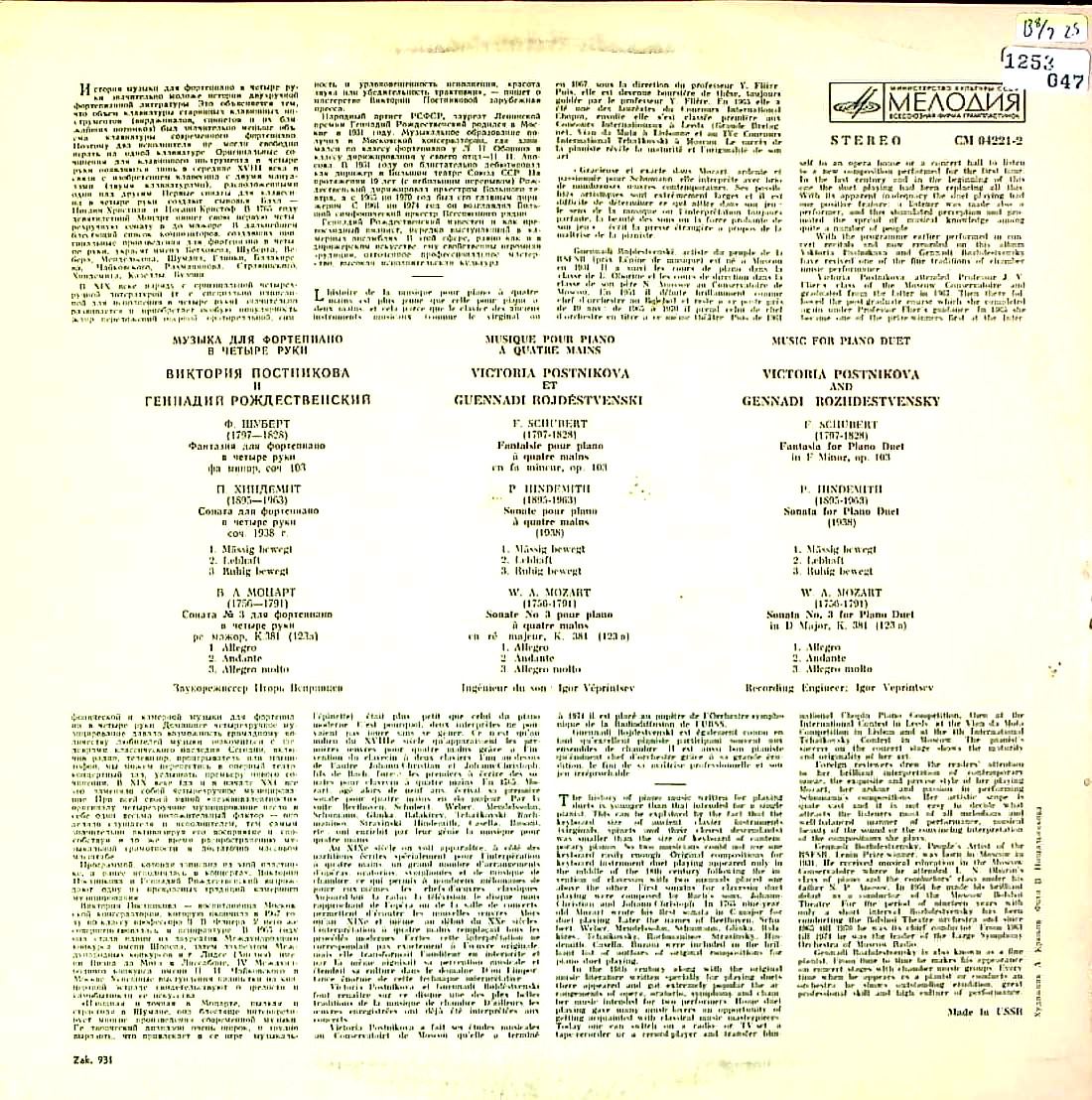 商品コード:1253-047n[MELODIYA] V.ポストニコワ G.ロジェストヴェンスキー(pf) / 4手Pf曲集/シューベルト:幻想曲, ヒンデミット:ソナタ, モーツァルト:ソナタK.381
