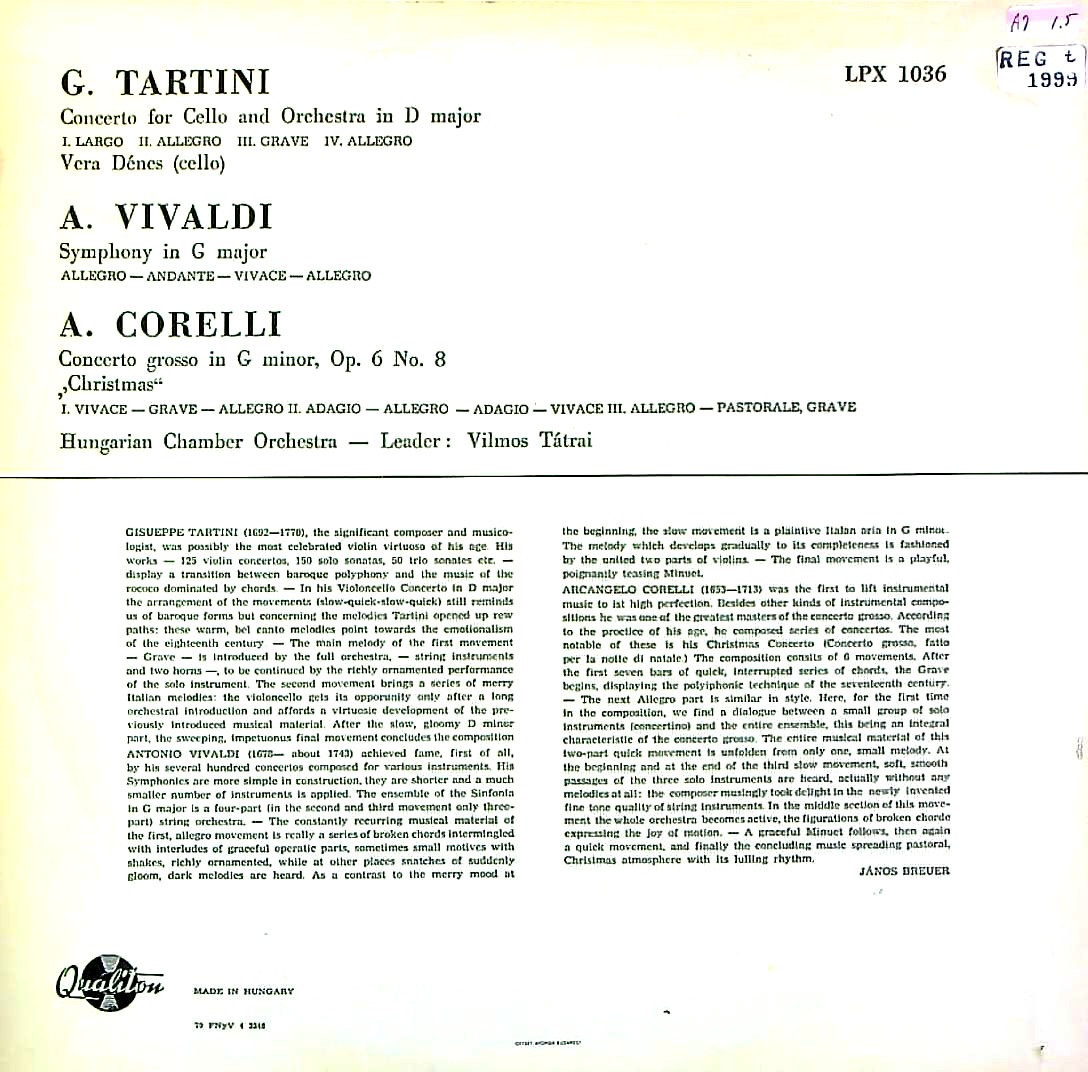 商品コード:REG-1999t[洪QUALITON] V.タートライ指揮ハンガリー室内o. V.デーネシュ(vc) / タルティーニ:Vc協奏曲, ヴィヴァルディ:シンフォニア, コレッリ:コンチェルトグロッソ「クリスマス」Op.6-8