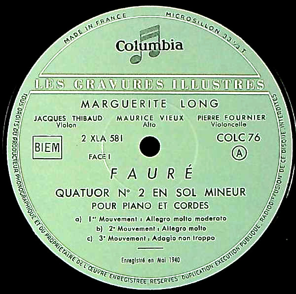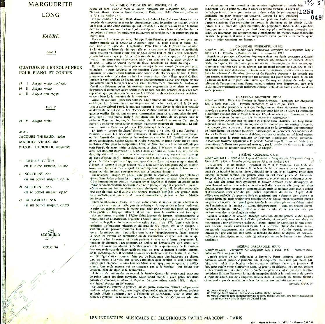 商品コード:1254-049[COLUMBIA] M.ロン(pf) J.ティボー(vn) M.ヴュー(va) P.フルニエ(vc) / フォーレ:Pf四重奏曲2番, 即興曲5番Op.102, 夜想曲4番Op.36, 夜想曲6番Op.63, 舟歌6番Op.70