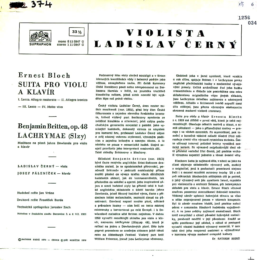 商品コード:1256-034[SUPRAPHON] L.チェルニー(va) J.パーレニチェク(pf) / ブロッホ:VcとPfのための組曲, ブリテン:ラクリメ-ダウランド歌曲の投影 Op. 48a