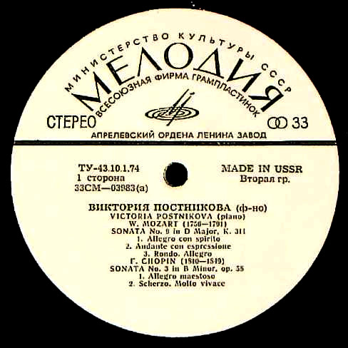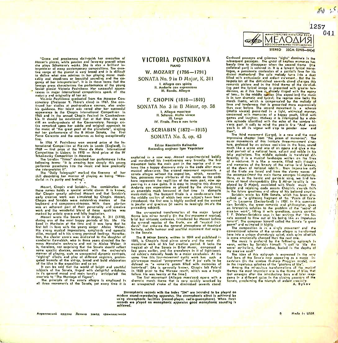 商品コード:1257-041n[MELODIYA] V.ポストニコワ(pf) / モーツァルト:Pfソナタ9番, ショパン:Pfソナタ3番, スクリャービン:PfソナタOp.53